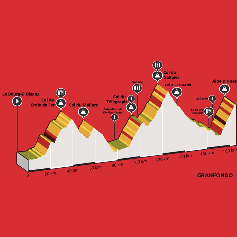 Eigentlich ist im Rennbericht von 2022 ja schon alles zur Strecke gesagt. Aber die Organisatoren haben sich für dieses Jahr ein besonderes Schmankerl ausgedacht: Den Col de Mollard. Ein "kleiner" Gegenanstieg nach einer kurzen Abfahrt vom Col de la Croix de Fer, der in diesem Jahr statt des Col du Glandon befahren wird. Es geht also von Le Bourg d'Oisans aus hinauf auf den Croix de Fer, hinüber zum Mollard, hinab ins Maurienne Tal und von dort über den Col du Télégraphe hinauf zum Col du Galibier. Dort erwartet uns die längste Abfahrt hinab über den Col du Lautaret bis zurück nach Le Bourg d'Oisans von wo aus es wieder hinauf nach Alpe d'Huez geht.